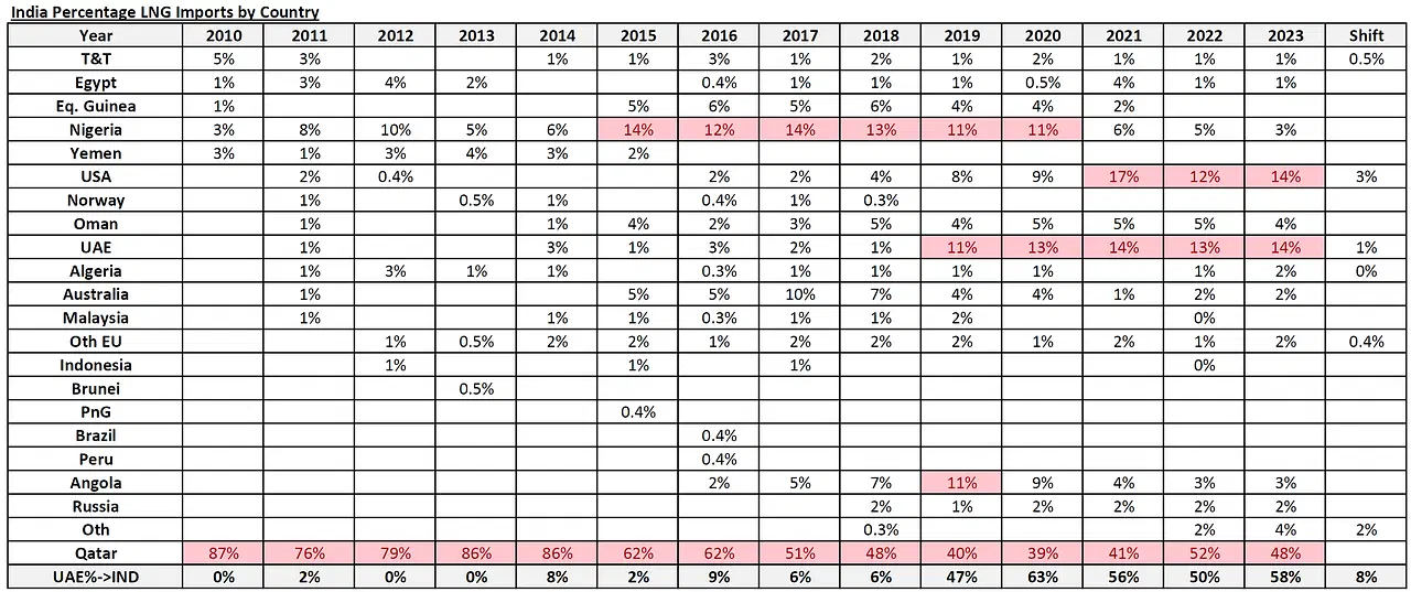 Even more affected is Australia, which declined from 10 per cent of Indian LNG imports in 2017 to just over 1 solitary per cent in 2023.