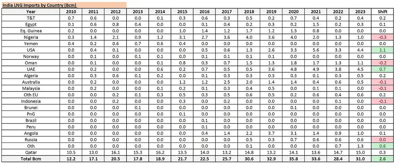This article focuses on gas imports, and a table of country-wise sourcing of volumes since 2010 is given below. Units are in billion cubic metres (bcm).